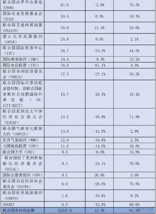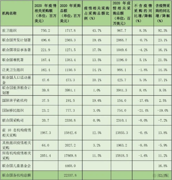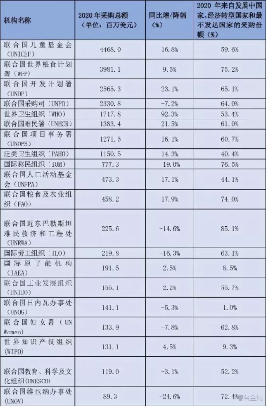 以下是2020年各聯(lián)合國機(jī)構(gòu)的采購額、同比及從“發(fā)展中國家、經(jīng)濟(jì)轉(zhuǎn)型國家和最不發(fā)達(dá)國家”的采購額占比:
