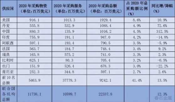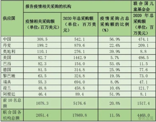 在全球抗疫過程中,世界各國、聯(lián)合國機(jī)構(gòu)之間互相分享信息,并采取了一系列防控和救治舉措,每個國家都交出了一份自己的答卷,也有許多國家在聯(lián)合國采購的疫情相關(guān)方面發(fā)揮了舉足輕重的作用。下表為2020年疫情相關(guān)采購的前10大供應(yīng)國:
