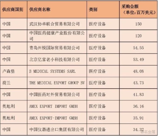由上表可得,中國在疫情相關(guān)采購中的供給首屈一指,聯(lián)合國從中國采購的疫情相關(guān)產(chǎn)品及服務(wù)總額達(dá)3.08億美元,其中2.15億美元為醫(yī)療設(shè)備采購;位列第三的是奧地利,貢獻(xiàn)了1.1億美元采購額,主要用于醫(yī)療設(shè)備(6600萬美元)和實驗室與檢測設(shè)備(2700萬美元)。